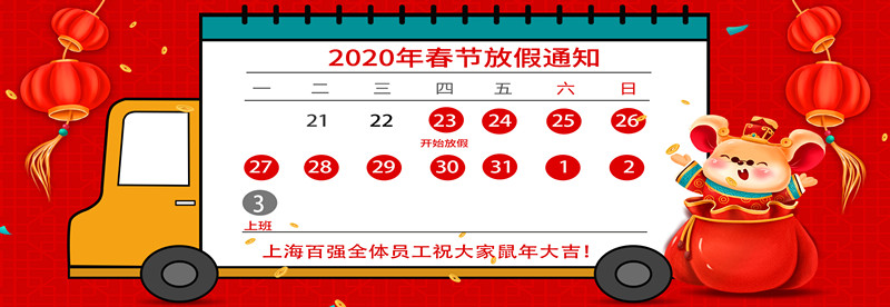 百強洗滌設備放假通知,現將2020年春節放假安排通知如下:1月23日至2月2日放假調休,共10天。2月3日(星期一)上班。節假日期間,公司除值班人員按照值班表做好值班工作之外,其他人員休息。